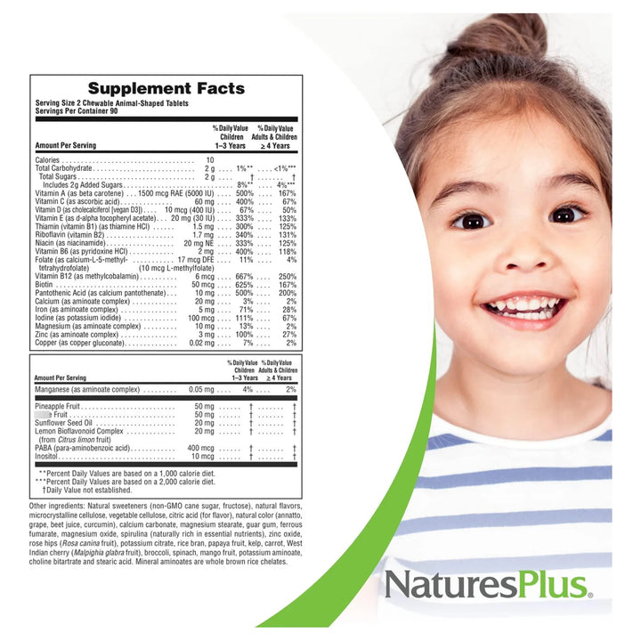Este multivitamínico está diseñado para complementar la dieta de tus hijos, proporcionando los nutrientes esenciales que pueden faltar en su alimentación diaria. Cada tableta masticable contiene una mezcla equilibrada de vitaminas, minerales y alimentos integrales, asegurando que reciban todo lo necesario para un desarrollo óptimo.