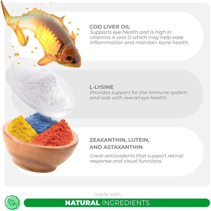 Los Apoyos Oculares Para Perros actúan desde adentro hacia afuera. Los ácidos grasos Omega 3 nutren las células oculares, mientras que los antioxidantes combaten los radicales libres que pueden dañar la visión. Las vitaminas incluidas en la fórmula apoyan la producción de lágrimas naturales, manteniendo los ojos hidratados y libres de irritación.