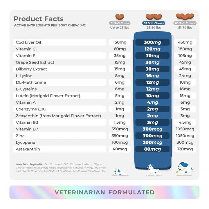 Imagina la tranquilidad de saber que estás haciendo todo lo posible por cuidar la visión de tu mejor amigo. Con cada masticable, estarás aportando ácidos grasos Omega 3, vitaminas y antioxidantes que combaten la sequedad ocular, reducen la inflamación y previenen problemas a largo plazo. No esperes a que los síntomas empeoren; actúa ahora y dale a tu perro el regalo de una visión clara y cómoda.