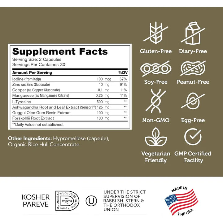 Cada cápsula de este producto está diseñada para proporcionar nutrientes esenciales que impulsan la función tiroidea, lo que a su vez regula el metabolismo y niveles de energía. La combinación estratégica de yodo, L-tirosina, zinc y cobre actúa de manera multidimensional: