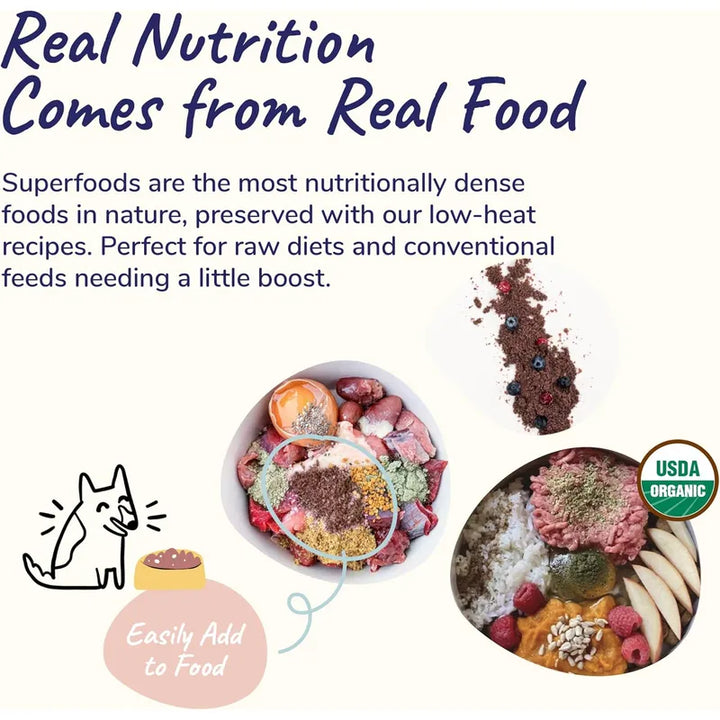 Con nuestro polvo de arándano orgánico, te aseguras de que cada ingrediente cumple con la misión de fortalecer la salud de tu mascota. Este suplemento está lleno de superalimentos reales, sin OMG ni granos, para hacer de la salud un placer diario. ¡A las mascotas les encanta el sabor!