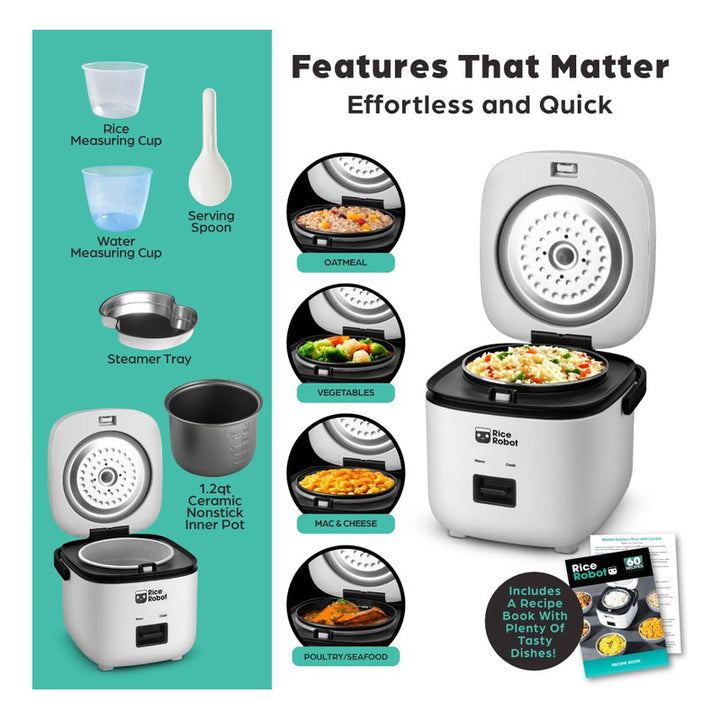 Imagina la libertad de crear diversos platos con la misma facilidad: desde un sushi casero hasta un reconfortante arroz con pollo. Con su tamaño de 1 cuarto de galón, el Rice Robot acomoda diversas recetas limpiamente, gracias a su olla antiadherente y apta para lavavajillas.