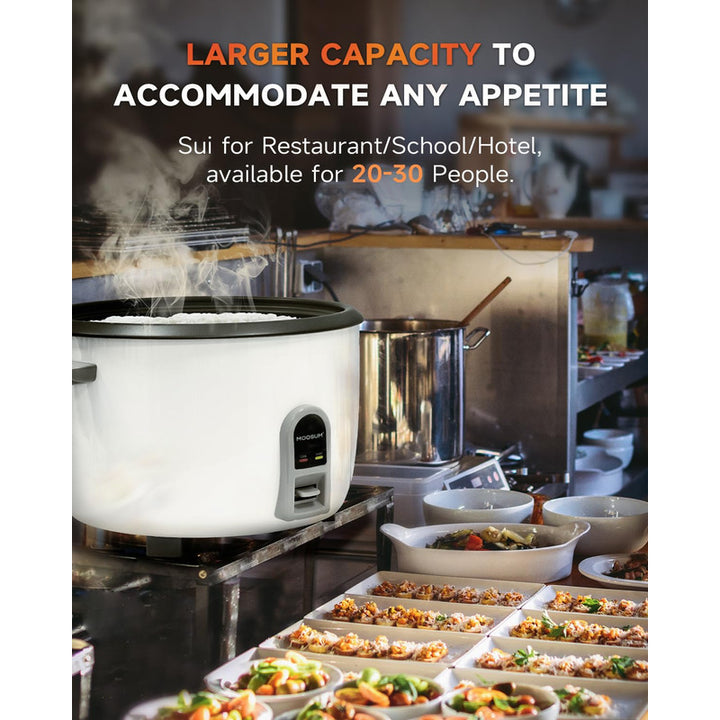 La Arrocera Moosum Commercial es fácil de usar y extremadamente eficiente. Simplemente mide la cantidad de arroz deseada con la taza medidora incluida, llena con agua según indicaciones, y presiona el botón de cocción. Tras 38 minutos, la arrocera cambia automáticamente al modo de mantener caliente, asegurándose de que el arroz esté listo para servir cuando lo necesites.