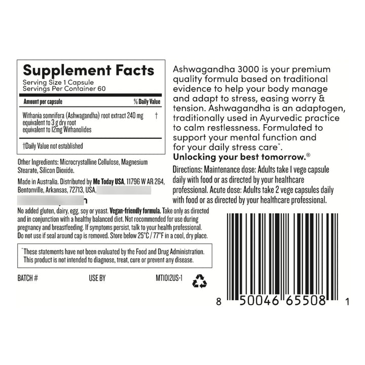Ashwagandha 3000 Mg Suplemento Alivio Estrés Soporte Mental 60 Cápsulas