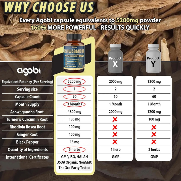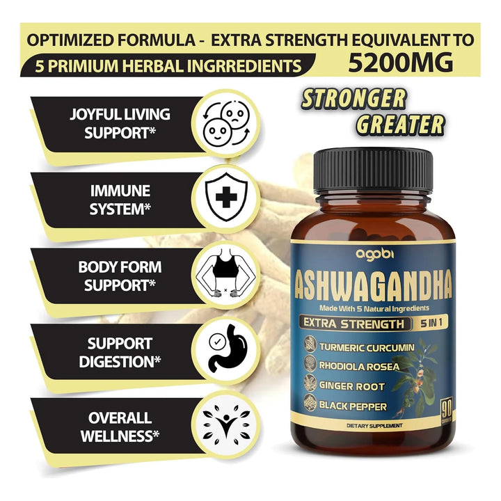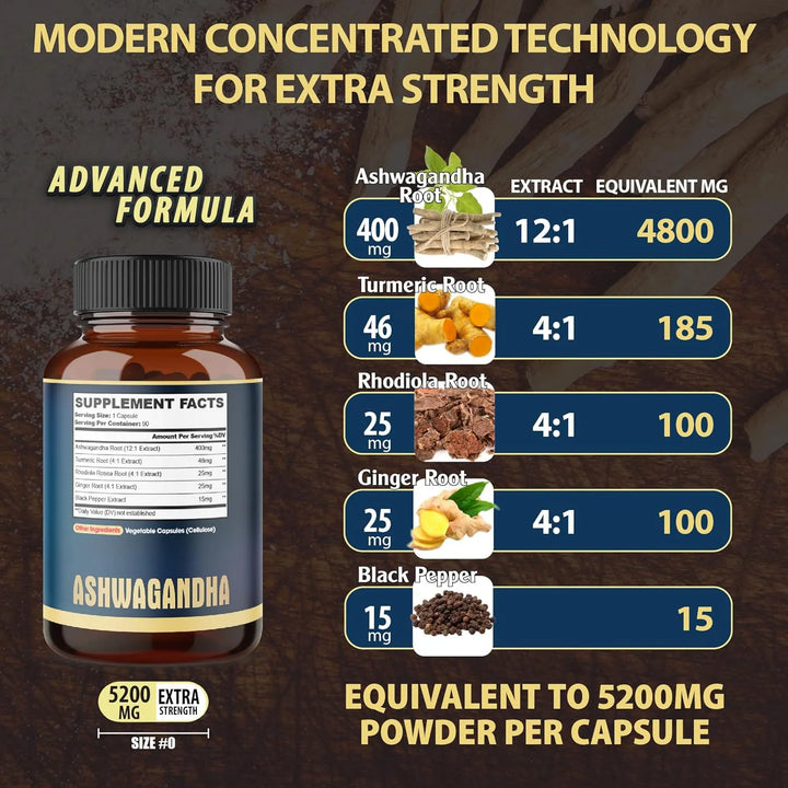 Ashwagandha 5200 Mg Con Jengibre Curcumina Rhodiola Rosea 90 Capsulas Vegano