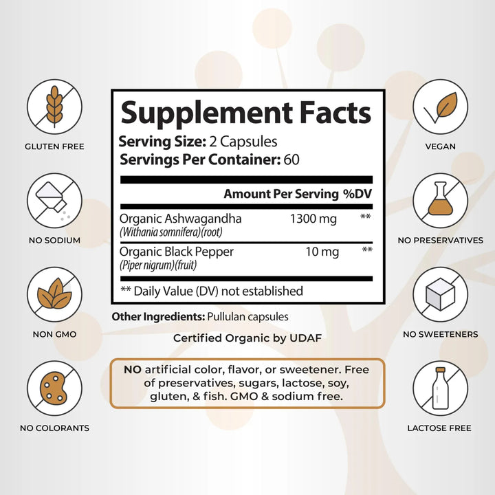 Este poderoso adaptógeno, enriquecido con pimienta negra para una absorción óptima, es tu aliado para manejar el estrés, mejorar tu estado de ánimo y potenciar tu energía. Cada cápsula contiene 1300 mg de extracto puro de raíz de ashwagandha, cultivada orgánicamente y libre de OMG, gluten y aditivos artificiales. No es solo un suplemento, es una inversión en tu bienestar a largo plazo.
