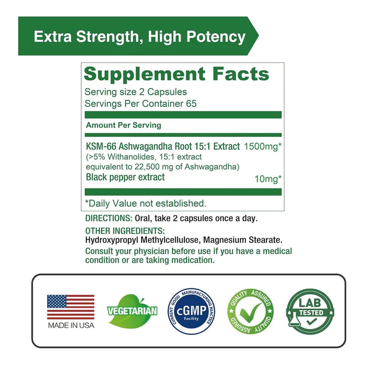 Ashwagandha KSM-66 Altamente Concentrado Con Piperina Vegano