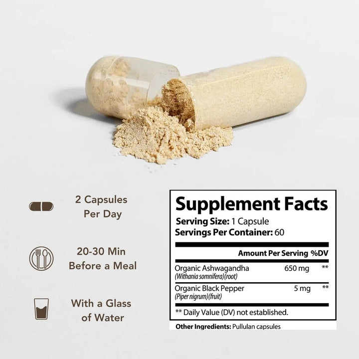 - 650 mg de ashwagandha orgánica por cápsula para máxima eficacia 🌿