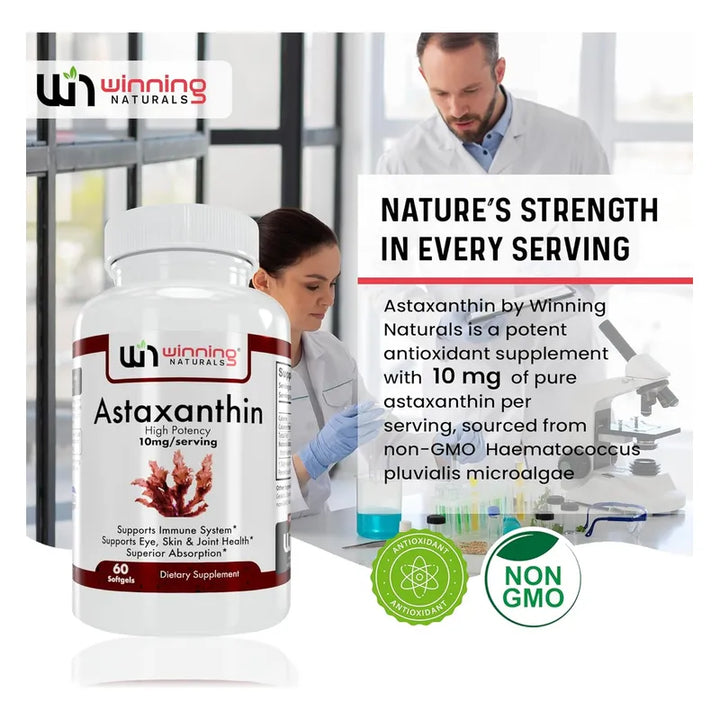La astaxantina que ofrecemos es de calidad prémium, formulada en los Estados Unidos bajo los más altos estándares de pureza y potencia. Nuestro producto es libre de alérgenos comunes como el gluten y el trigo, lo que garantiza una ingesta segura sin comprometer la calidad. Finalmente, una cápsula diaria junto con una comida rica en grasas maximiza la absorción de estos valiosos nutrientes, asegurando que tu cuerpo aproveche al máximo sus beneficios.