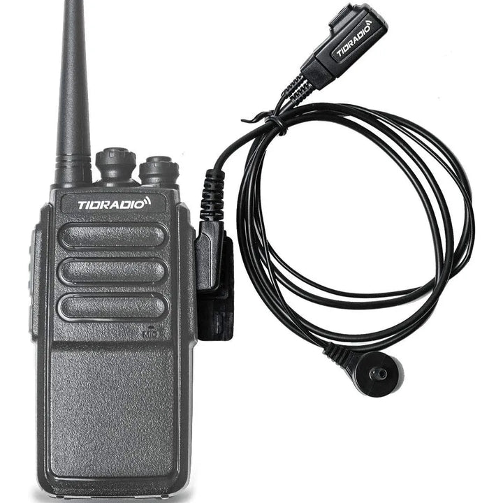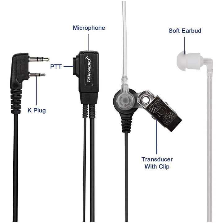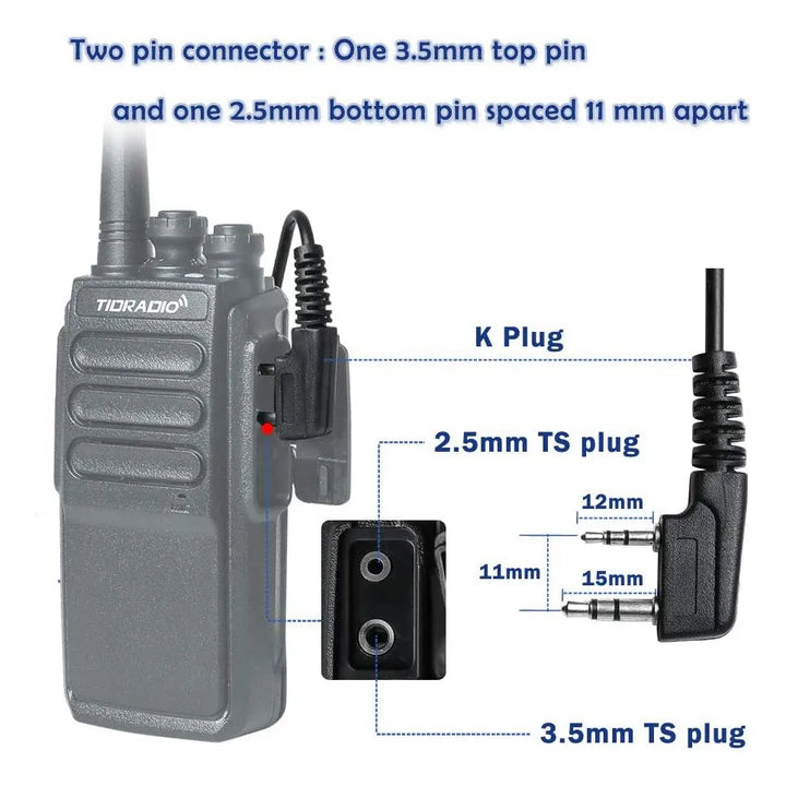El auricular se conecta fácilmente a tu walkie talkie mediante el conector de 2 pines. Una vez conectado, el tubo acústico dirige el sonido directamente a tu oído, asegurando claridad y privacidad. El micrófono integrado capta tu voz con precisión, permitiéndote comunicarte sin necesidad de sostener el dispositivo.