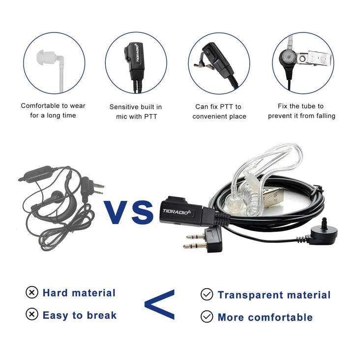 Imagina poder comunicarte sin tener que sostener el walkie talkie en tus manos. Con nuestro auricular, tus conversaciones serán privadas y claras, gracias al tubo acústico que se ajusta perfectamente a tu oído. Además, su diseño ligero y suave te permitirá usarlo durante horas sin molestias. Perfecto para profesionales de seguridad, eventos al aire libre o cualquier actividad que requiera comunicación constante.