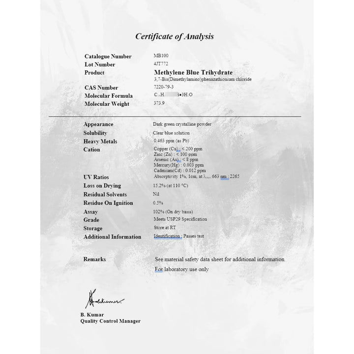 Imagina tener en tus manos un producto que no solo cumple, sino que supera tus expectativas. El Azul de Metileno USP es importado directamente desde Estados Unidos, asegurando que cada gota cumpla con las normativas más exigentes. Ya sea para uso profesional o personal, esta solución es versátil y confiable, ideal para quienes no aceptan compromisos en calidad.