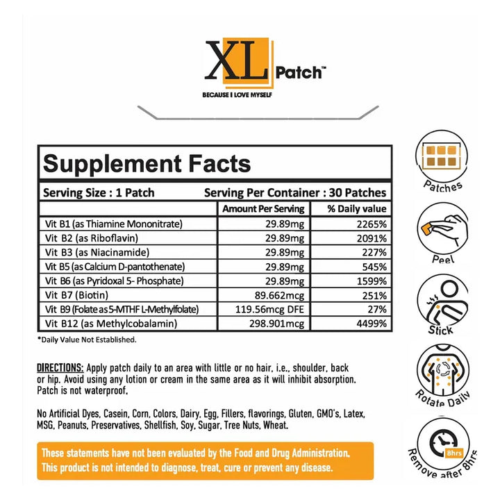 Los parches XLPatch liberan progresivamente vitamina B12, conocida por su papel fundamental en la producción de energía celular. Al usar los parches, la vitamina se absorbe a través de la piel para proporcionar un impulso sostenido.