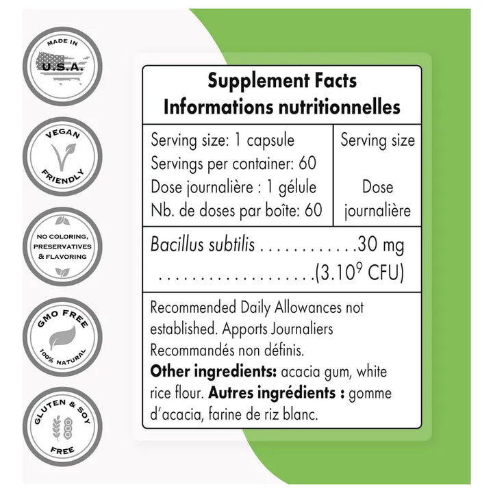 La combinación perfecta para un estilo de vida saludable: Bacillus Subtilis no solo está libre de OMG y gluten, sino que también es apto para vegetarianos, permitiendo que se integre sin problemas en cualquier dieta. Además, al estar elaborado con atención meticulosa a los detalles, puedes confiar en que cada cápsula está diseñada para liberar sus beneficios justo cuando tu cuerpo más lo necesita.