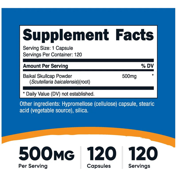 Las 120 cápsulas de Baikal Skullcap contienen 500 mg de extracto en cada una, ofreciéndote una dosis altamente efectiva para mejorar tu salud día a día. Al ingerirlo, el suplemento trabaja potenciando la salud celular y apoyando tu sistema inmunológico.