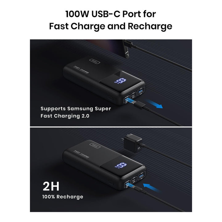 Este innovador cargador portátil no solo ofrece la increíble potencia de 100 W para tus portátiles y dispositivos más exigentes, sino que también se recarga a sí mismo con gran rapidez. Con su puerto USB-C de doble entrada y salida, tendrás la flexibilidad de cargar varios dispositivos con facilidad, sin complicaciones. ⚡