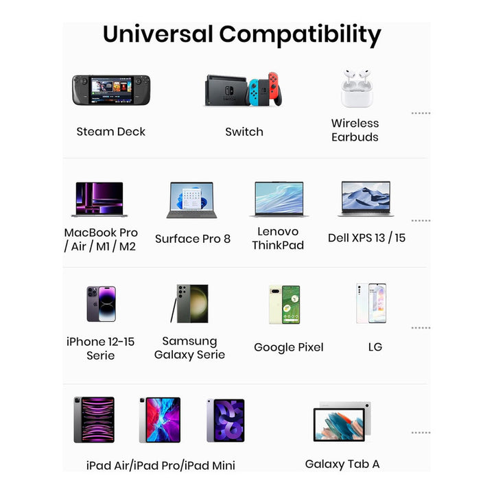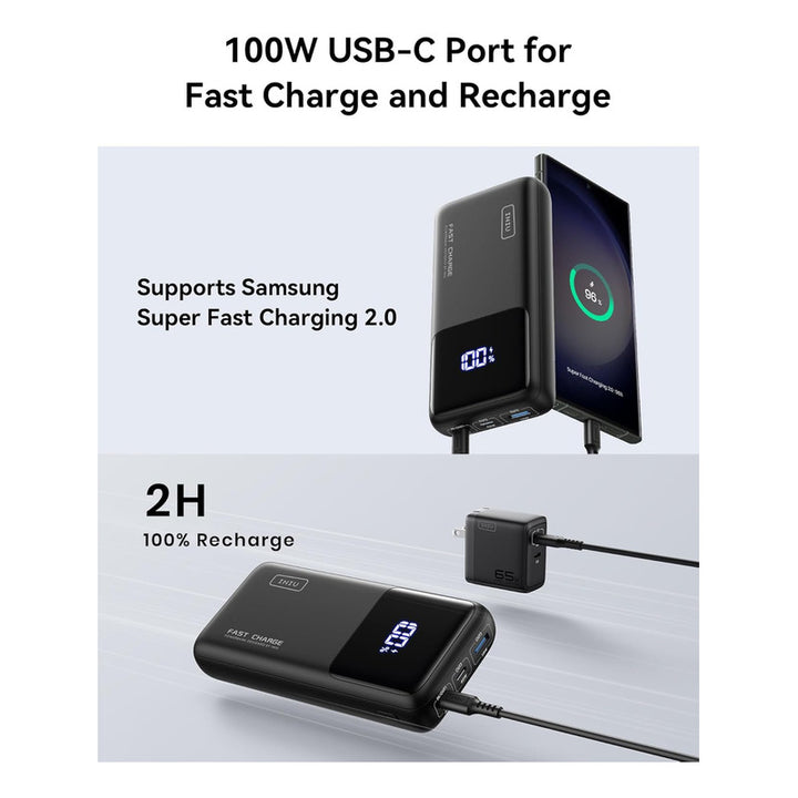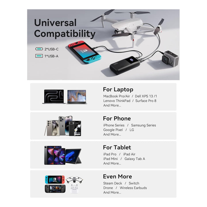 Desde tu iPhone hasta tu MacBook, el Banco de Energía Iniu satisface cada demanda. Con salidas duales USB-C, puedes adaptar tu carga según tus necesidades. Perfecto para el profesional siempre en movimiento como para el usuario que solo quiere una carga confiable.