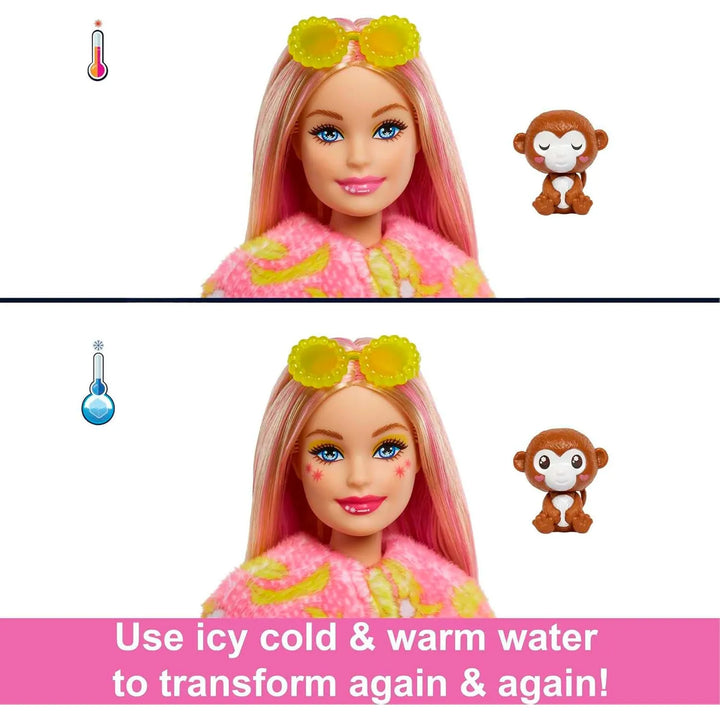 La Barbie Cutie Reveal ofrece una experiencia interactiva única. Primero, desempaca el peluche de mono para encontrar la muñeca Barbie en su interior. Luego, abre las bolsas sorpresa para descubrir accesorios y moda. Usa agua fría para activar los cambios de color en la cara de la muñeca y los ojos de la mini mascota. Invierte el disfraz para convertirlo en una chaqueta o cama, ¡y listo! La diversión está asegurada.