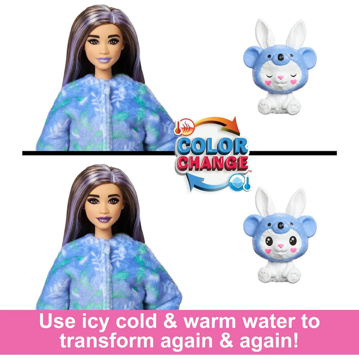 La magia de Barbie Cutie Reveal comienza al desempacar: primero encuentran el peluche (conejo-koala), al levantar su cabeza descubren la muñeca articulada. Las bolsas sorpresa contienen moda y accesorios para vestirla. El disfraz se invierte para convertirse en chaqueta, y al aplicar agua fría/caliente, ¡la cara y ojos de la mascota cambian de color! La cabeza del peluche se gira para crear una cama, completando un ciclo de juego infinito.
