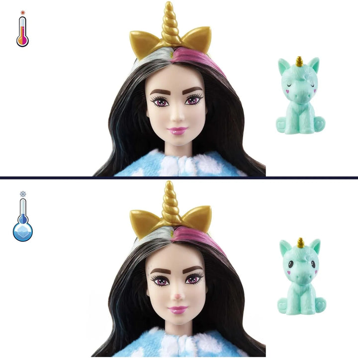La magia comienza al desempacar: encuentra el unicornio de peluche y revela a Barbie dentro. Usa agua fría para activar los cambios de color en su cara y los ojos del unicornio, y agua tibia para revertirlo. Viste a Barbie con los accesorios incluidos y transforma el disfraz en una cama acogedora para la mascota. ¡Cada paso es una nueva sorpresa!