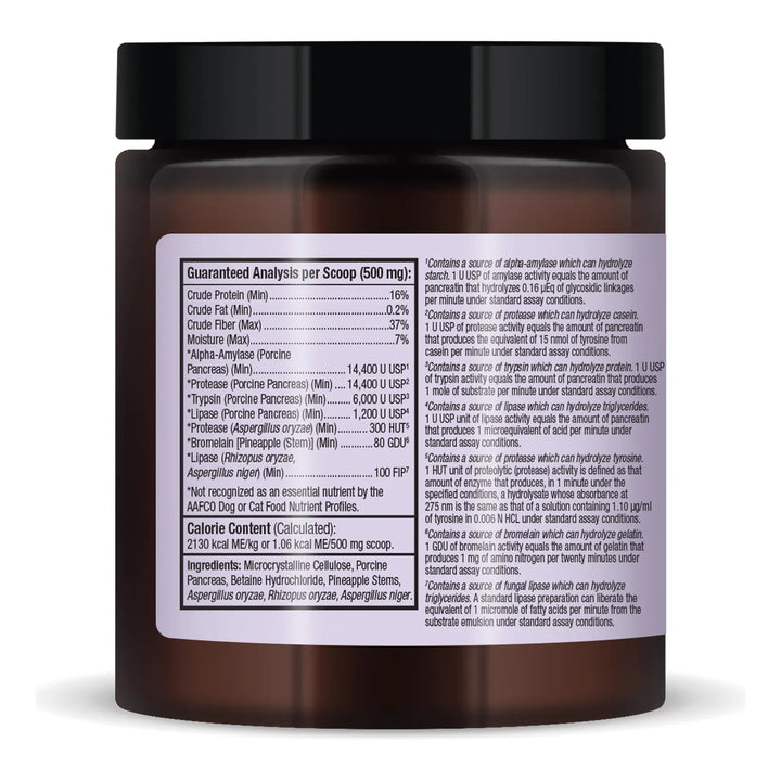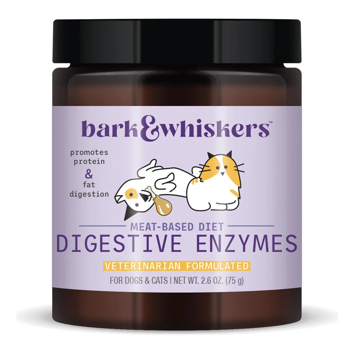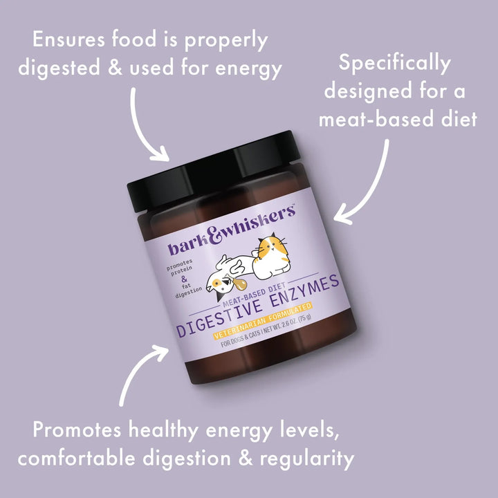 Bark & Whiskers soluciona esto con una mezcla precisa de enzimas que trabajan en armonía con su biología. No es un medicamento, no es un suplemento artificial, es simplemente lo que su naturaleza carnívora requiere para prosperar.