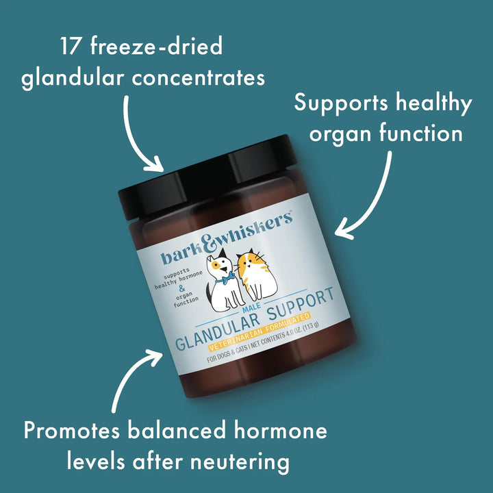 El Soporte Glandular Masculino de Bark & Whiskers actúa proporcionando componentes naturales que nutren las glándulas y tejidos de tu mascota. Al administrarse diariamente, ayuda a mantener un equilibrio hormonal saludable, promoviendo energía, vitalidad y una función orgánica óptima. Es como un multivitamínico especializado, pero diseñado específicamente para las necesidades glandulares de perros y gatos.