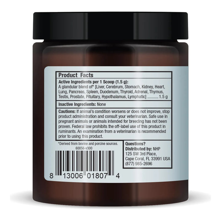 Cada cucharada de esta fórmula única contiene 17 concentrados glandulares liofilizados, provenientes de vacas y cerdos criados en campos libres de hormonas y antibióticos. Es 100% natural, sin OMG, gluten o soja, lo que lo convierte en la opción más segura y efectiva para tu mascota. ¿Por qué conformarte con menos cuando puedes brindarle lo mejor?