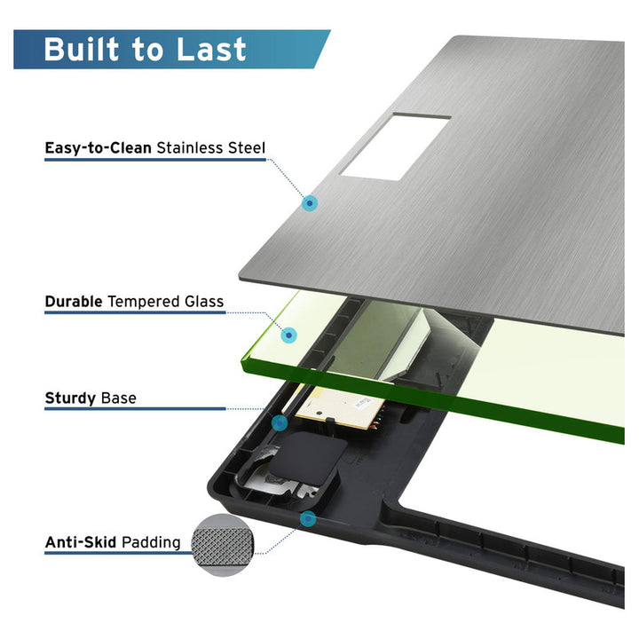 Esta báscula está especialmente diseñada para cualquier entorno. Con una resistente plataforma de acero inoxidable y un acabado en metal cepillado que repele las manchas, facilitará el mantenimiento y la limpieza. Nunca más te preocupes por el cristal que se rompe, ya que su carcasa metálica está reforzada para ofrecer la máxima seguridad y confianza en cada uso.