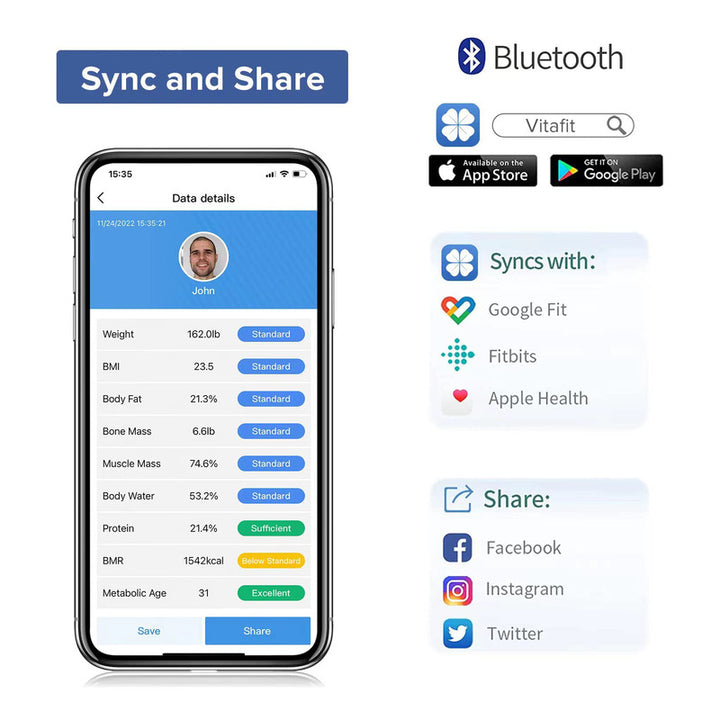 La Vitafit mide la composición corporal a través de un análisis de impedancia bioeléctrica genuino. Al subirse en la báscula, cuatro electrodos calibran datos precisos sobre tu cuerpo, usando algoritmos desarrollados y perfeccionados a lo largo de dos décadas. Sincroniza los datos automáticamente con la App Vitafit para acceder a estadísticas detalladas y útiles.
