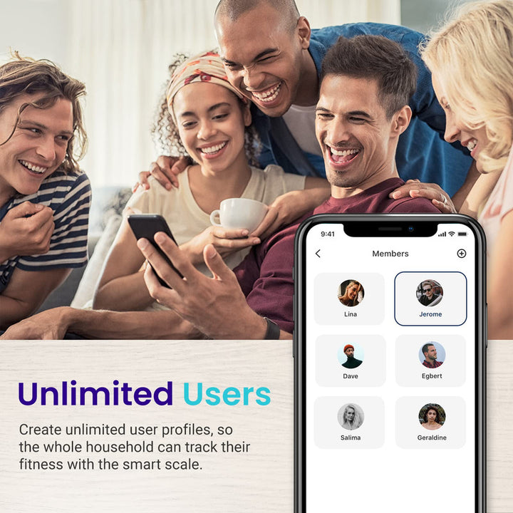 Nuestro dispositivo no solo se ocupa de medir tu peso. Con 12 medidas de composición corporal, te ofrece una perspectiva completa: Grasa corporal, agua corporal, masa muscular, masa ósea, proteínas, BMR, edad metabólica, grasa visceral, grasa subcutánea, peso corporal sin grasa e IMC.