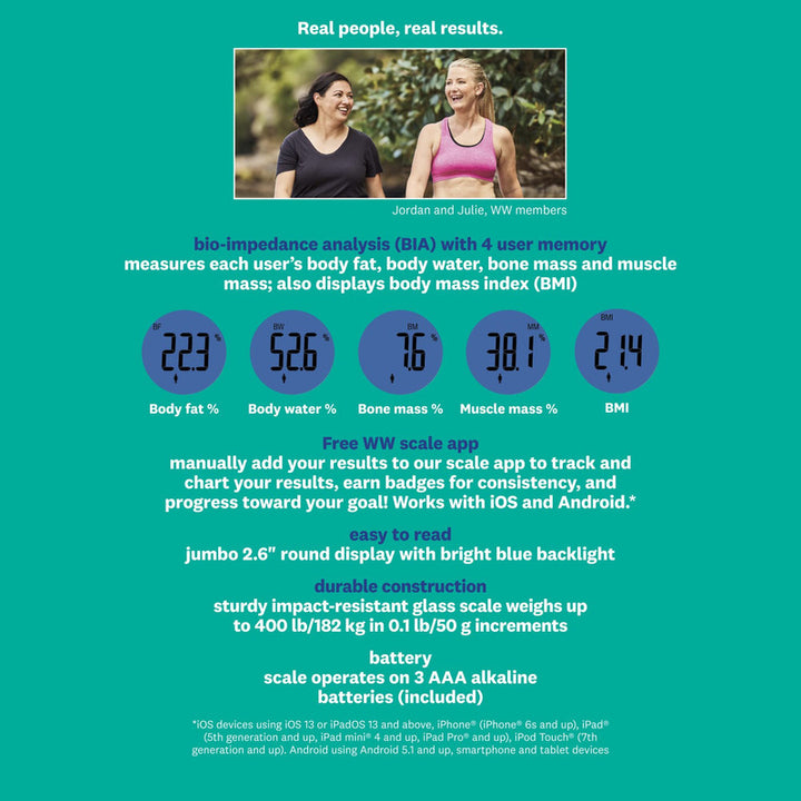 La báscula funciona a través de un análisis de bioimpedancia eléctrica que pasa una corriente muy baja a través del cuerpo. Esta corriente mide la resistencia del cuerpo, proporcionando detalles clave sobre su composición corporal y ayudando a definir las métricas necesarias para alcanzar tus objetivos. Con resultados instantáneos en su pantalla LCD, cada medición se hace de manera sencilla y eficaz.