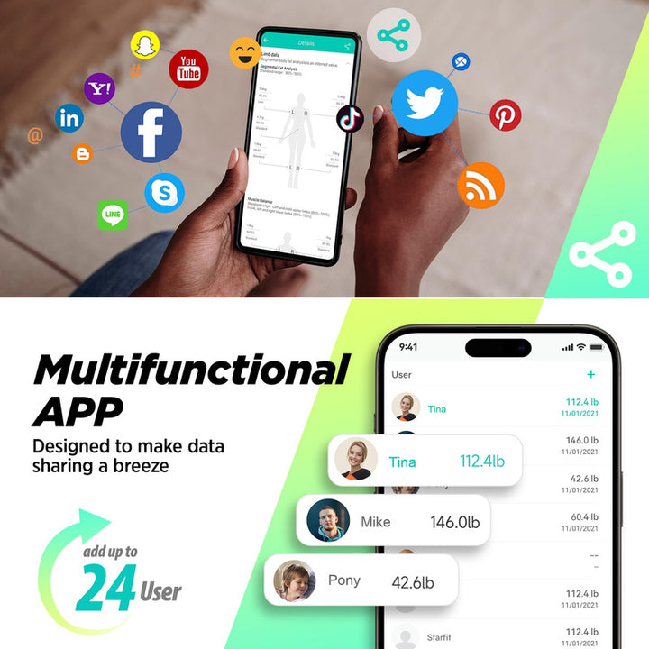 Cada vez que te subes a la báscula, el manejo de 8 electrodos en combinación con un mango telescópico se aseguran de proporcionarte resultados extremadamente precisos. No solo estás viendo un número, sino un reflejo real de todo tu progreso.
