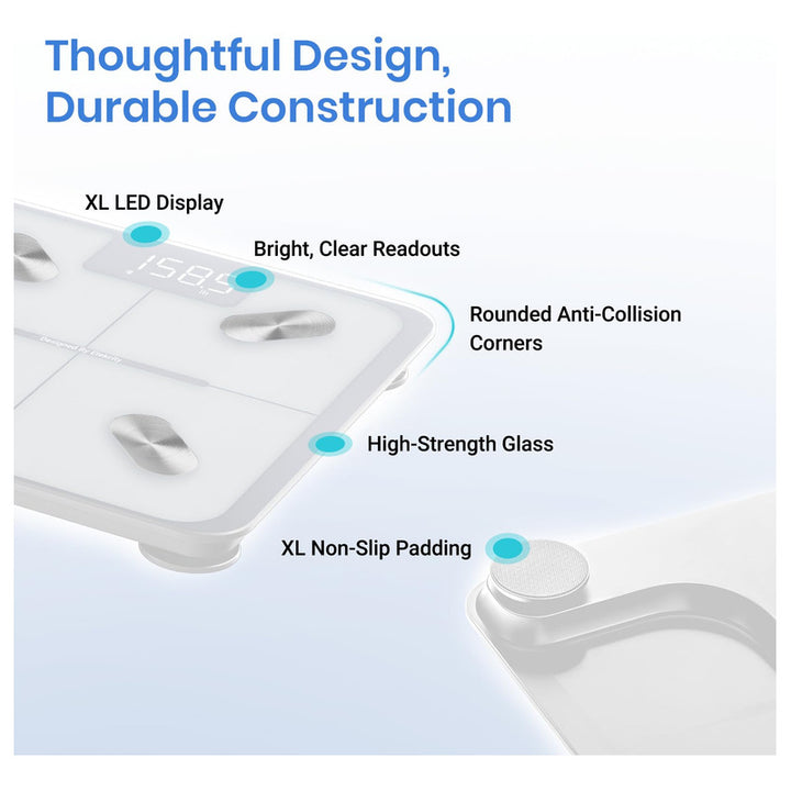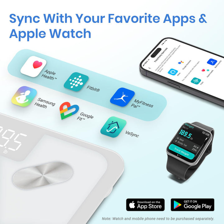 Esta no es solo una herramienta más en tu baño, es un todo en uno que se sincroniza con aplicaciones populares como Apple Health, Samsung Health, Google Fit, FitBit y MyFitnessPal. La tecnología avanzada te permite llevar un registro preciso de hasta 13 datos biométricos, de modo que cada centímetro de tu progreso es monitoreado y analizado para ti.