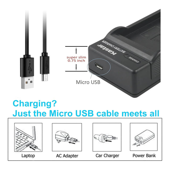 Imagina la libertad de tener dos baterías de alta capacidad, listas para usar en cualquier momento. No más cargas intermedias ni esperas interminables. Con celdas japonesas de primera calidad, estas baterías ofrecen una duración excepcional y cero efecto memoria, lo que significa que mantendrán su capacidad de carga por mucho más tiempo. ¿Y lo mejor? El cargador USB delgado y portátil te permite recargar en cualquier lugar: en el auto, en tu computadora o incluso con un power bank.