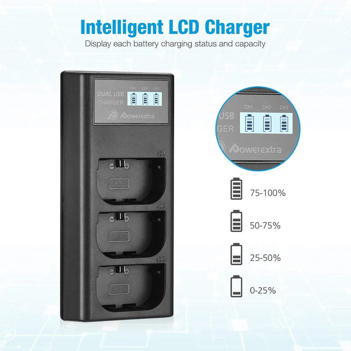 Las baterías Powerextra LP-E6/LP-E6N utilizan tecnología de iones de litio de alta calidad para ofrecer un rendimiento constante y duradero. El cargador inteligente detecta el estado de cada batería y ajusta la corriente de carga para maximizar su vida útil. La pantalla LCD te mantiene informado en todo momento, mientras que las múltiples protecciones aseguran que cada carga sea segura y eficiente.