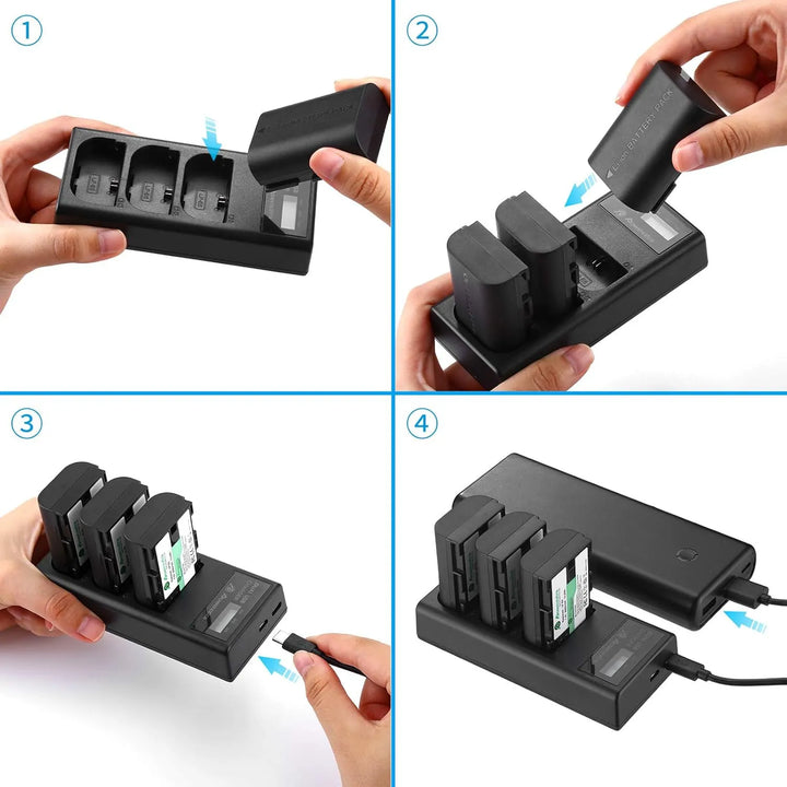 El cargador de tres canales con pantalla LCD no solo te ahorra tiempo, sino que también te brinda información en tiempo real sobre el estado de carga. Carga tres baterías simultáneamente y prepárate para tus próximas aventuras fotográficas sin esperas. Con entradas Micro-USB y Tipo-C, puedes cargar en casa, en el estudio o incluso en movimiento usando un power bank o el adaptador de tu auto.