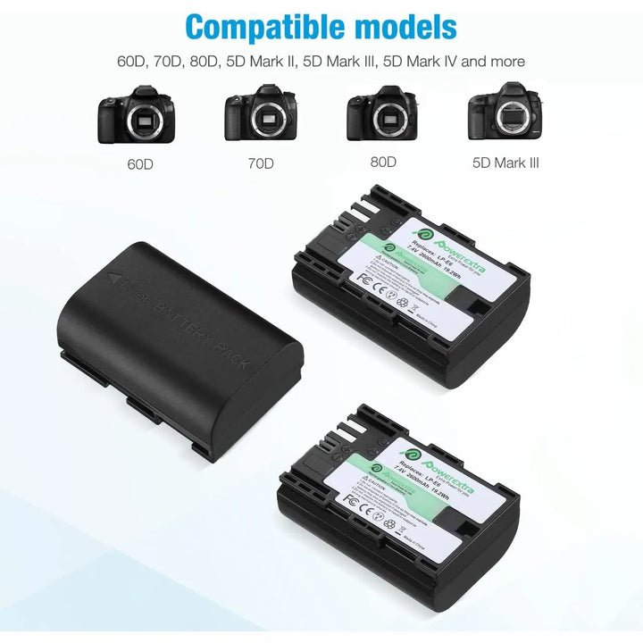 Estas baterías de iones de litio de alta calidad, con una capacidad de 2600 mAh y 7.4V, están diseñadas para durar. Olvídate del efecto memoria y disfruta de disparos prolongados sin preocupaciones. Compatibles con una amplia gama de cámaras Canon, incluyendo los modelos 5D, 6D, 7D, 80D y las series EOS R, son el reemplazo perfecto para tus baterías originales.