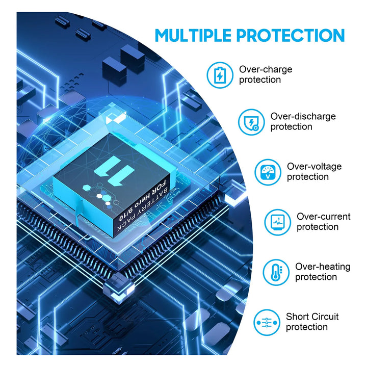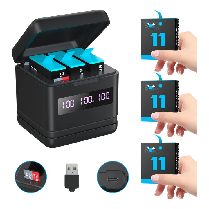 El paquete incluye 3 baterías que utilizan el mismo chip de energía que las originales, garantizando compatibilidad total y rendimiento óptimo. El cargador rápido recarga las baterías de manera eficiente mientras protege contra sobrecargas, y su función de lector de tarjetas permite transferir tus aventuras a otros dispositivos al instante.