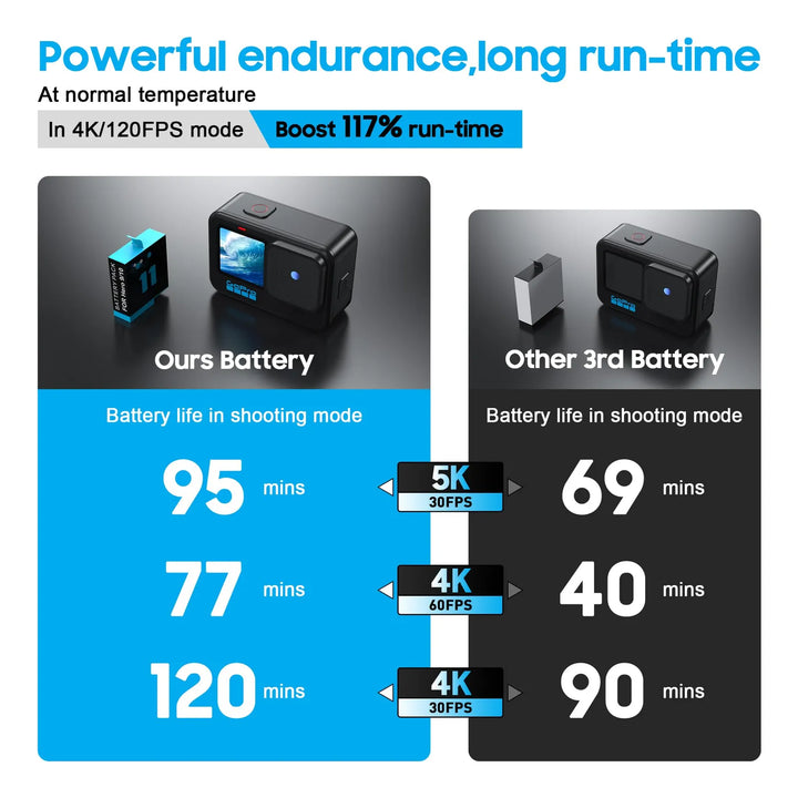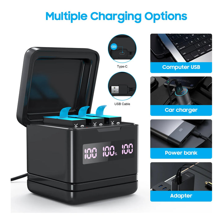 - 🔋 Carga inteligente: El cargador muestra el nivel de batería exacto como tu GoPro, para que siempre sepas cuándo cargar.