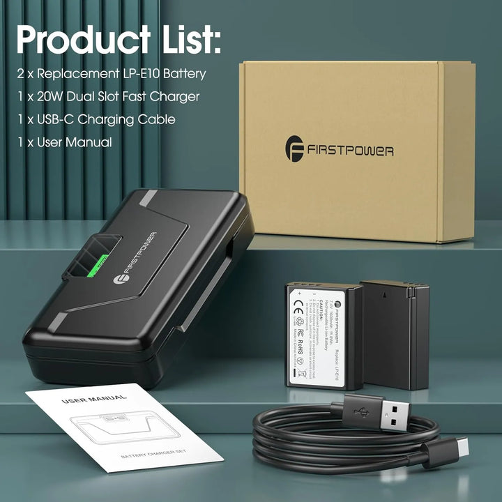 Baterías y Cargador Rápido Dual FirstPower LP-E10: Nunca Te Quedes Sin Energía