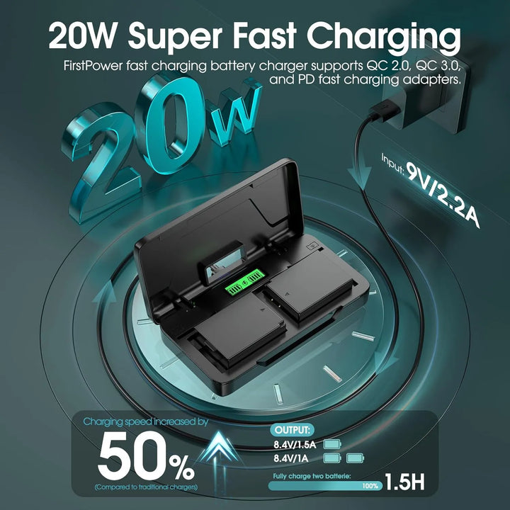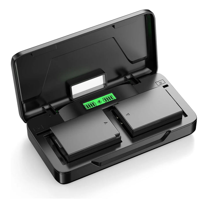 Este combo está diseñado específicamente para fotógrafos apasionados y creadores de contenido que no pueden permitirse perder ni un segundo. Las baterías de 1600 mAh ofrecen una duración extendida, permitiéndote tomar más fotos y grabar videos más largos sin preocuparte por quedarte sin energía. Y con el cargador rápido dual, podrás cargar ambas baterías al mismo tiempo en solo 1.5 horas, ¡un 50% más rápido que otros cargadores!