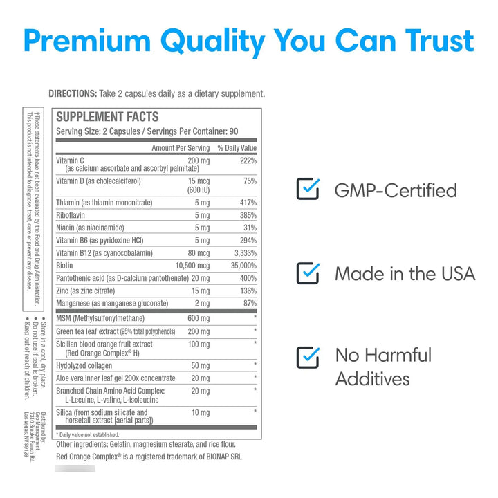 - ✨ Piel libre de manchas y más elástica: El extracto de naranja sanguina y el MSM combaten el fotoenvejecimiento y mejoran la producción de colágeno.