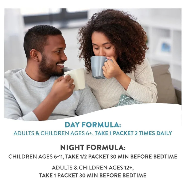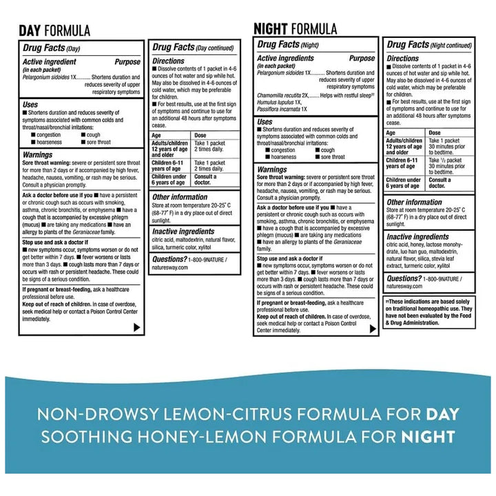 La sencillez del uso de Nature's Way Umcka lo hace perfecto para cualquier rutina. Simplemente disuelve un paquete de la fórmula de día o noche en agua caliente, dependiendo de la hora. Para adultos y niños a partir de 13 años, toma un paquete dos veces al día, y uno nocturno antes de dormir. Los niños de 6 a 12 años pueden disfrutar de un paquete de cada fórmula diariamente.