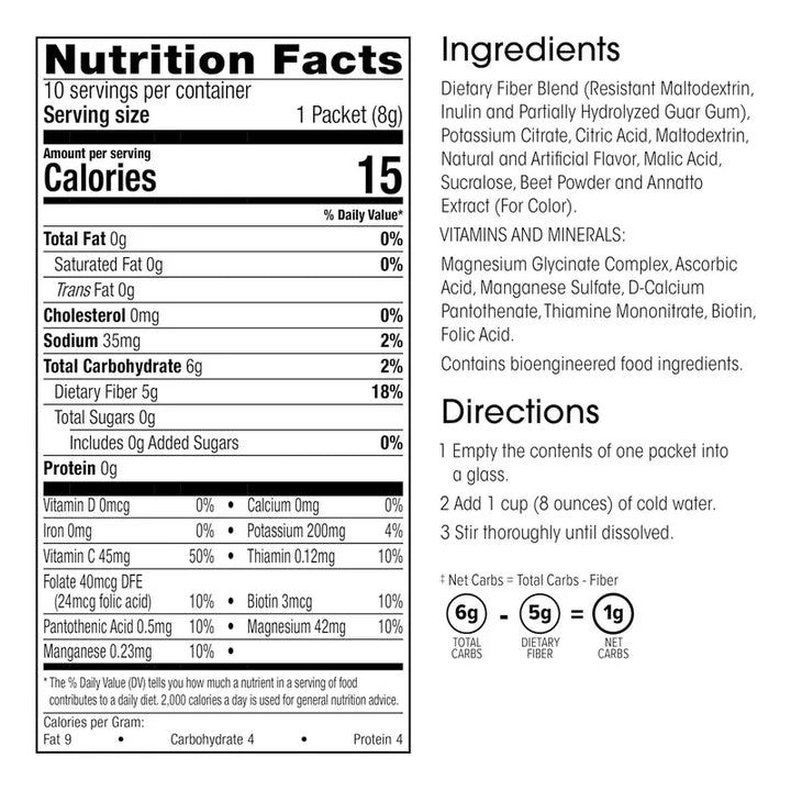Con cada porción de nuestra Bebida De Fibra Sabor Muy Baya, recibirás 0.18 oz de fibra, facilitándote alcanzar esos objetivos de salud que siempre has querido.
