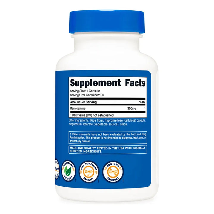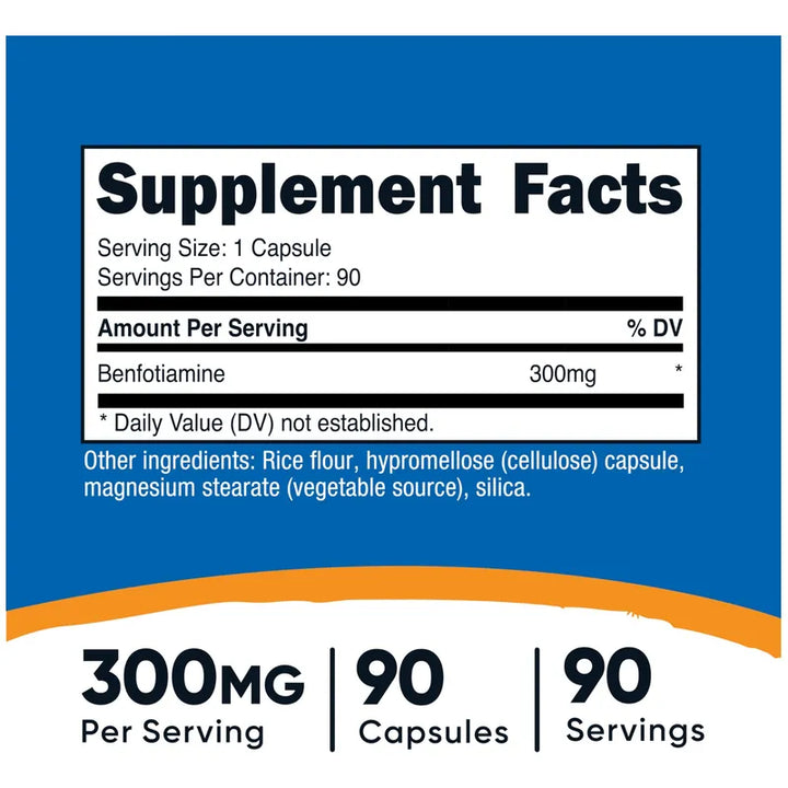 - 300 mg de benfotiamina por cápsula, un potente grado biodisponible de vitamina B1. 🎯