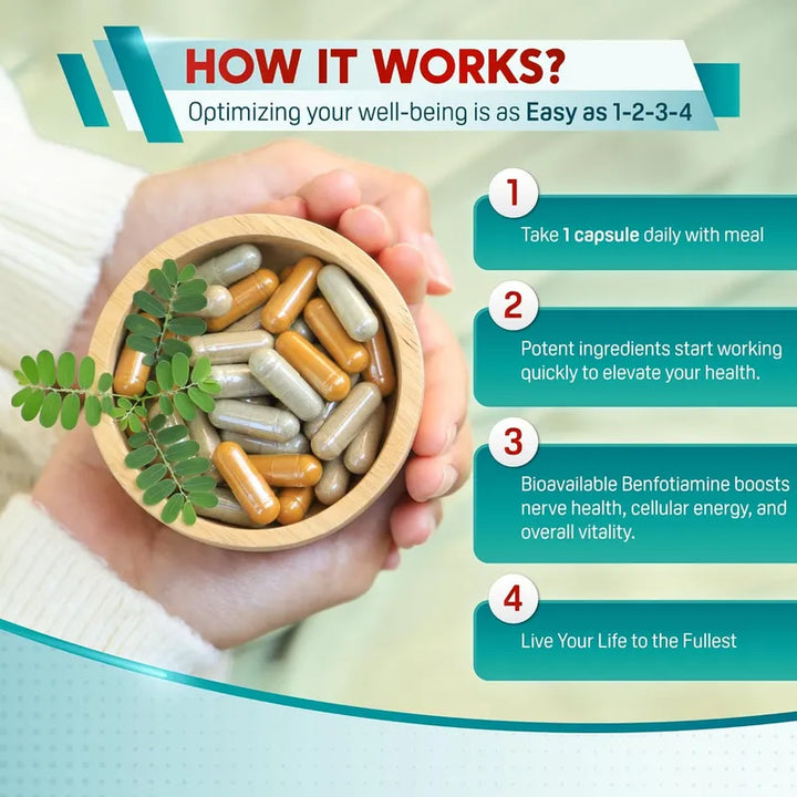 El suplemento combinado de Benfotiamina, Magnesio y Coenzima Q10 funciona al integrarse en tu sistema para ofrecer soporte a la función nerviosa, incrementar la producción de energía celular y proteger la salud ocular. Cada ingrediente ha sido seleccionado para ofrecer el máximo beneficio, asegurando una transformación significativa en tu bienestar.