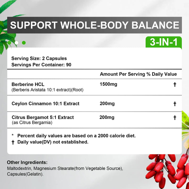 - Fórmula premium: 1500 mg de berberina HCL + 200 mg de canela y bergamota para máxima efectividad 🌿