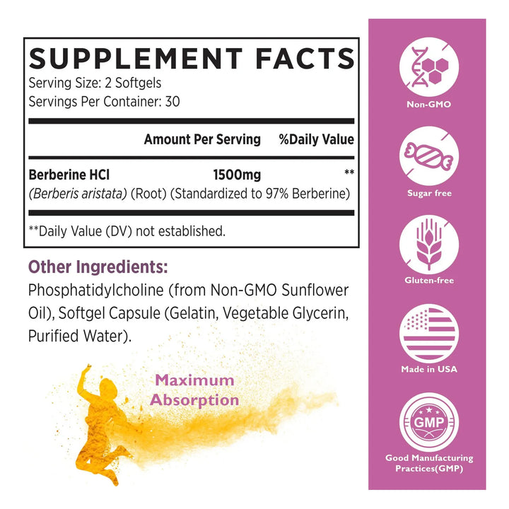 - 1500 mg de berberina HCL por dosis, la forma más estable y efectiva. 🔬