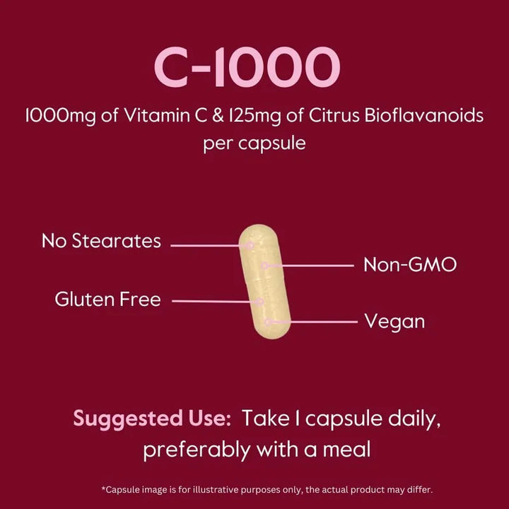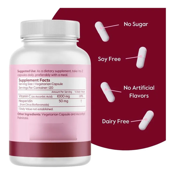 Con cada cápsula, no solo estás obteniendo 1000 mg de vitamina C, sino también una cuidada dosis de 125 mg de bioflavonoides, elementos clave que proporcionan protección antioxidante y contribuyen a la síntesis de colágeno para una piel radiante y saludable.