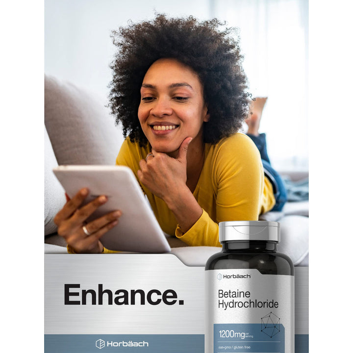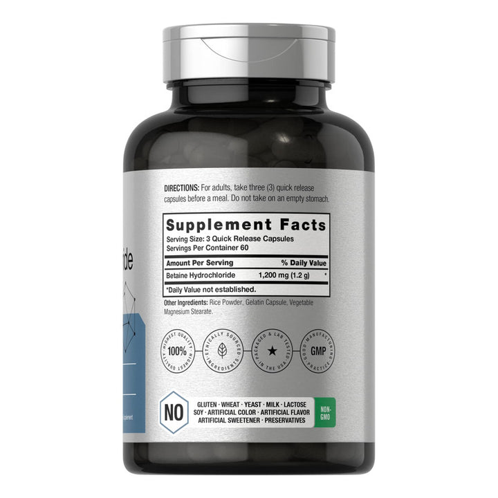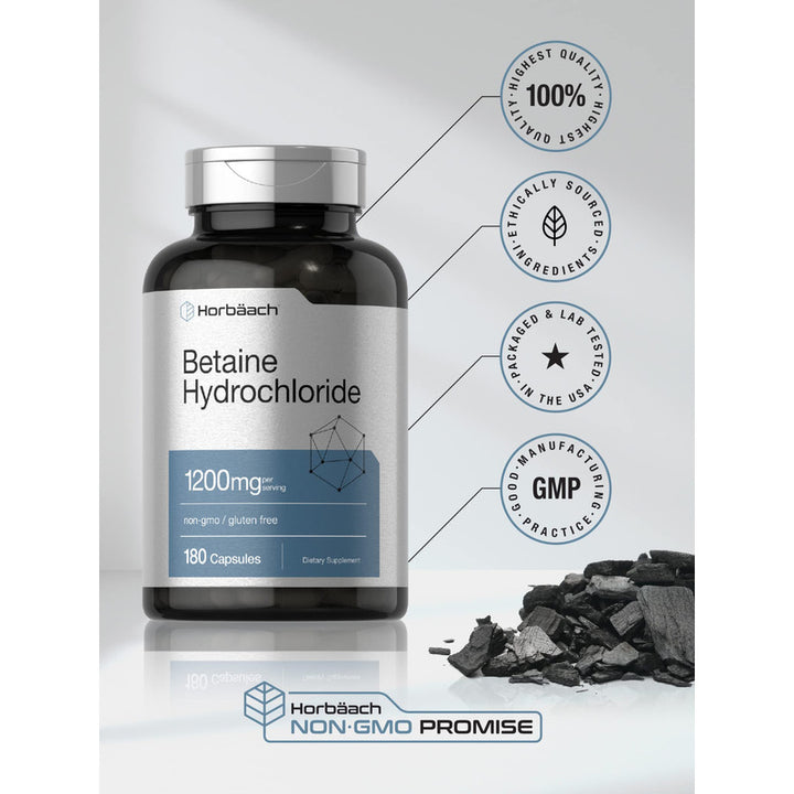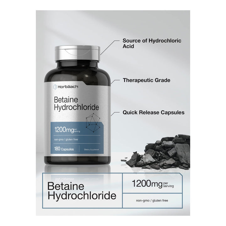 Con cada dosis, estás proporcionando a tu cuerpo una forma artificial del aminoácido modificado Betaína, conocido por su capacidad para apoyar la función digestiva. Esta potente fórmula cuenta con 1,200 mg de clorhidrato de betaína por porción, haciendo que tu camino hacia la salud óptima sea tan sencillo como consumir una cápsula de liberación rápida. Cada una de nuestras cápsulas ha sido elaborada profesionalmente con un abastecimiento minucioso que garantiza la máxima pureza y potencia, tal como lo esperarías de un fabricante de renombre como Horbaach.
